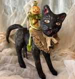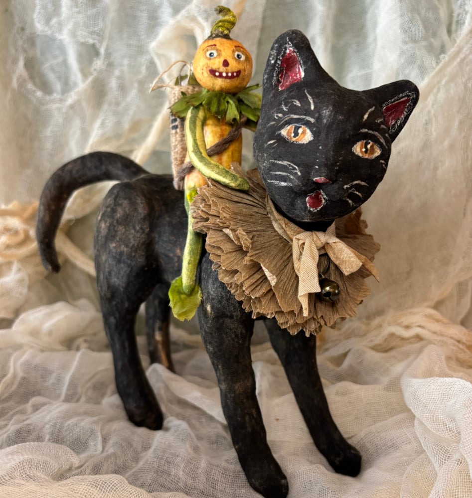 Using images of old Victorian postcards as inspiration, I created a mischievous veggie head riding a spun cotton black cat. The whole piece is all handmade by me and I have used lots of vintage embellments. Mr. Veggie Head wears a collar from vintage leaves. His feet are made from vintage fabric to look like leaves. He carries a handmade basket on his back with a tiny spun cotton turnip inside! He's not too happy either because he has no idea what is in store? Soup? The tiny turnip has vintage crepe paper arms and legs and sits in a basket of wood straw. The black cat wears a collar of vintage crepe paper and an aged silk bow with a tiny bell. The pumpkin man is firmly attached to the cat. The piece measures 8" tall and 8-1/4" long.