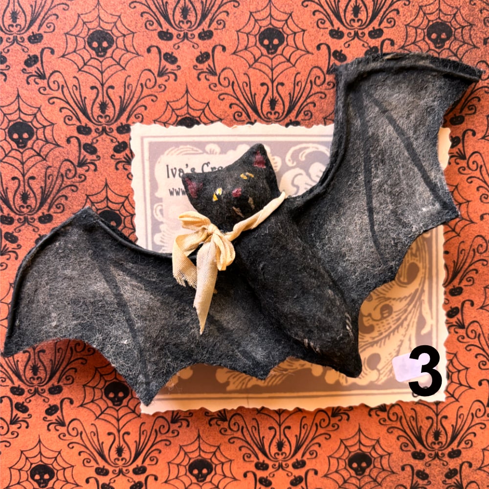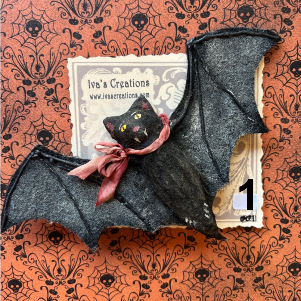 A vintage inspired spun cotton bat lapel pin is the perfect addition to your Halloween wardrobe! Add one of these little cuties to your hat, a bag or even your Halloween tree! Each one is different and comes with a silk ribbon tied at the neck. A pin back allows for attaching to clothing. It is made using age-old Victorian techniques and measures about 6' wide and 3-1/2" tall.