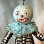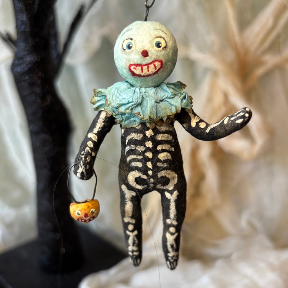 A vintage inspired spun cotton veggie head ornament is ready to haunt your Halloween tree. He is made using age-old Victorian techniques. He wears a vintage crepe paper collar, and I have painted his smiling features along with his bones! He holds the tiniest of jack-o-lantern buckets. The ornament itself is about 4-1/4"" tall, and I will provide a wire hook for easy hanging.