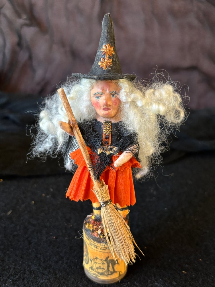 I created cute Matilda from spun cotton. Her paper mache face was made by me and all handpainted. Her wild hair is lamb's wool. She stands on a tiny vintage spool decked out in images of vintage Halloween advertisements on hand dyed paper. The color of fall "leaves" are scattered among her feet. She wears a black shawl and has gold Dresden accents down her neckline. Lots of tiny details went into creating her. She stands 5-1/2" tall.