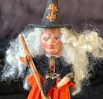 Little Matilda the witch is ready to help make your Halloween a fun celebration! She will cast a spell on you with her sweet vintage orange crepe paper skirt! Her hat is spun cotton adorned with two Dresden gold stars. Her tiny broom is ready for take off!