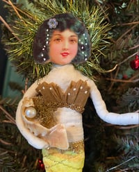 She has a Victorian Era reproduction paper scrap face and vintage crepe paper bra, which is trimmed in gold dresden. Her crown is made of vintage iridescent beads and backed with vintage tinsel. She holds a real shell with gold boullion and a small pearl. Gold elastic twine forms the loop for a perfect display with your antiques. Vintage crinkle wire creates the shimmer of her tail scales. She has been painted and stained for a truly bygone look.